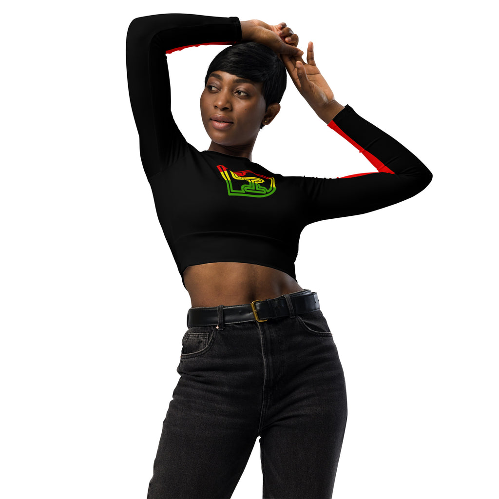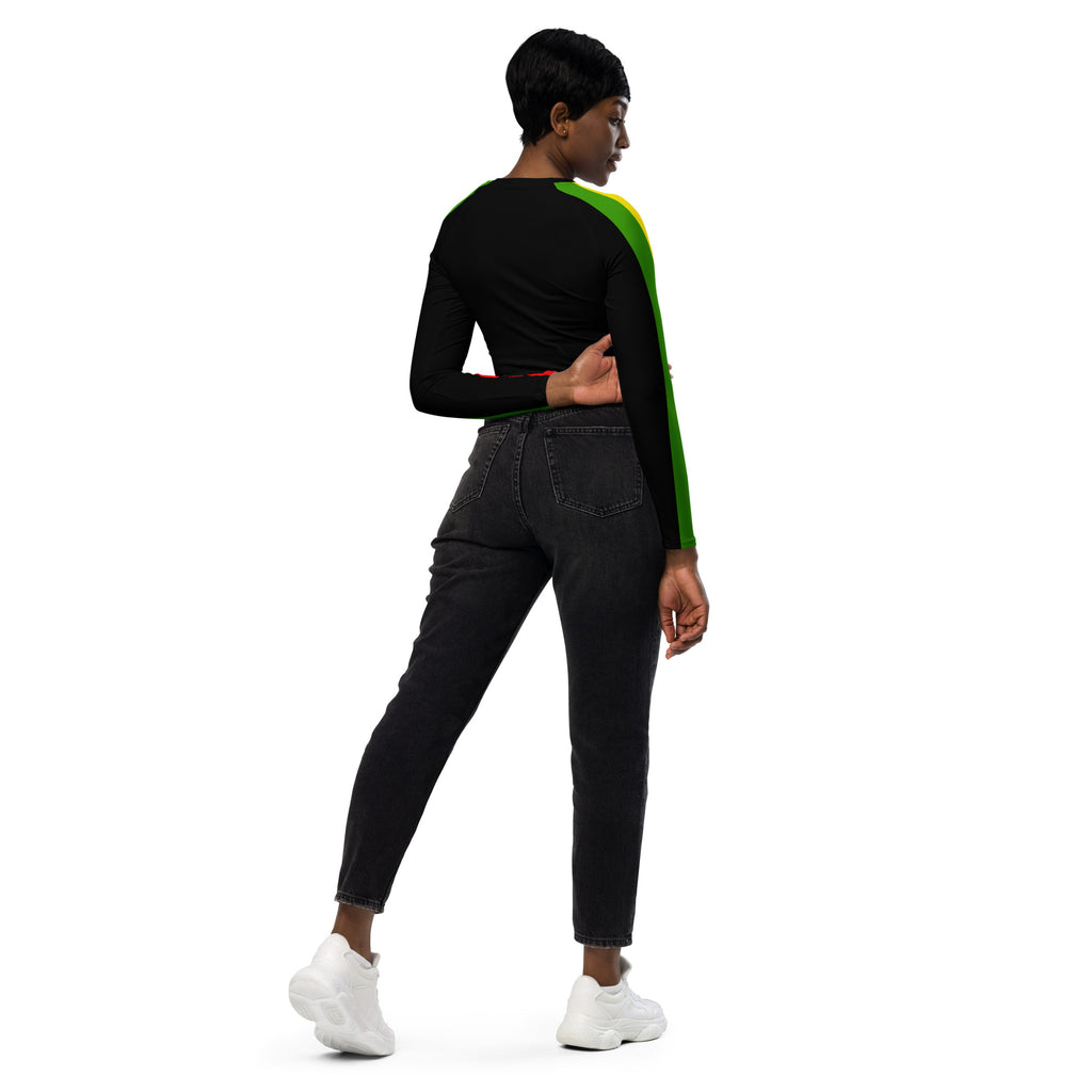 This long-sleeve crop top is made of recycled polyester and elastane, making it an eco-friendly choice for swimming, sports, or athleisure outfits. The crop top has a tear-away care label and a wide, double-layered waistline band for a comfortable fit.